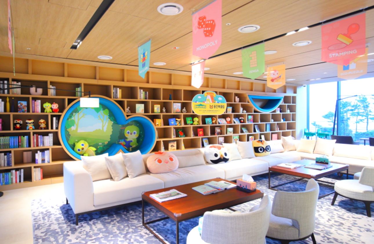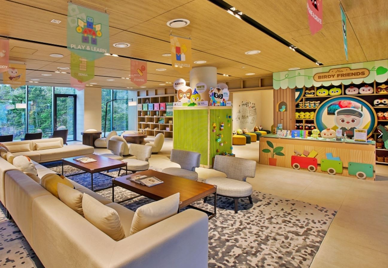 밥을 먹고 나면 소화를 시켜야죠? 아이와 함께 로비층에 있는 패밀리 라운지로 가서 이것저것 놀아봅니다. 불풀장에 볼이 아닌 피톤치드 향이 물씬 나는 공깃돌 크기의 나무들이 채워져 있어 아이가 즐거워합니다. 모든 것을 입으로 가져가는 구강기라서 먹지 않는지만 주의해서 보았습니다.
