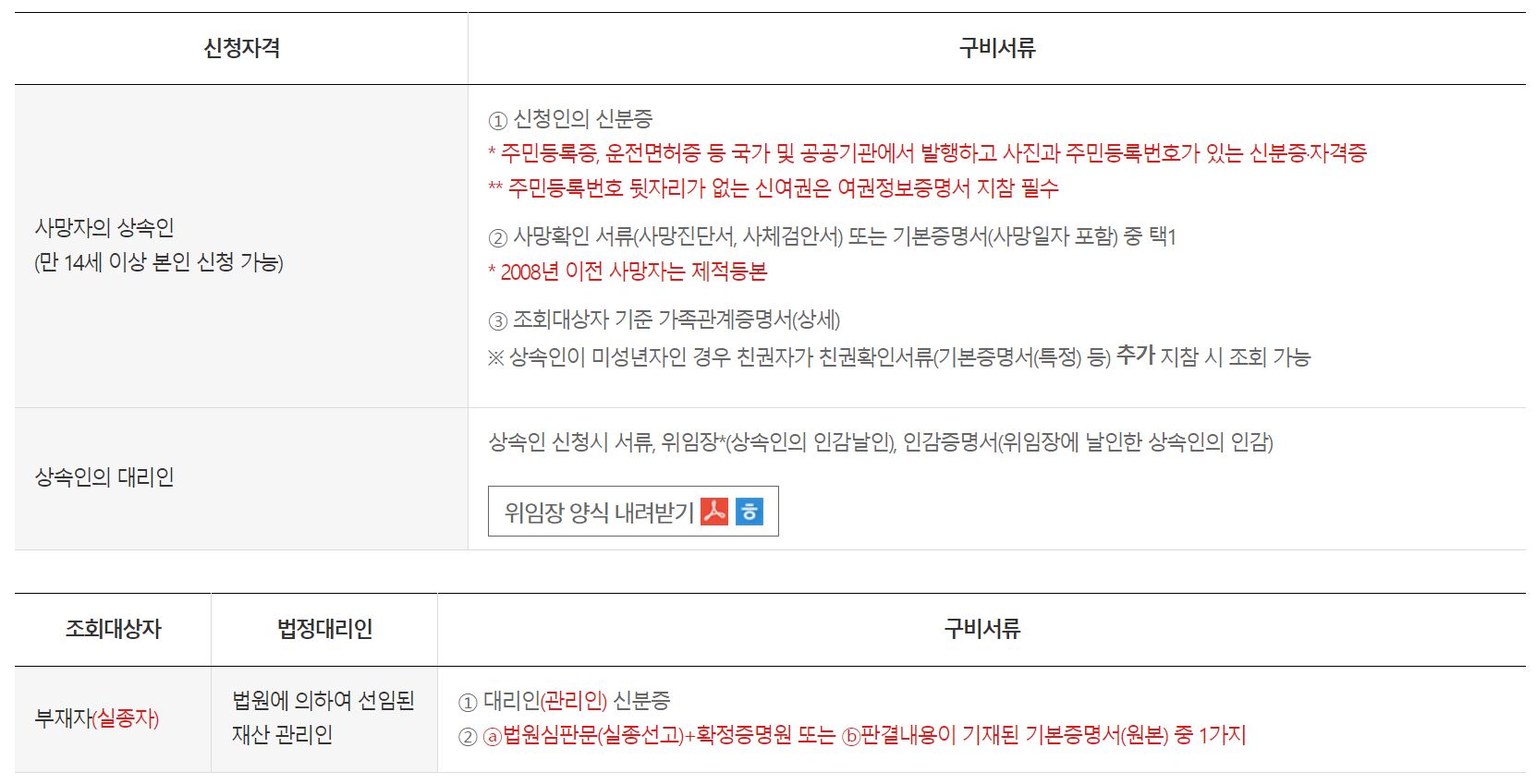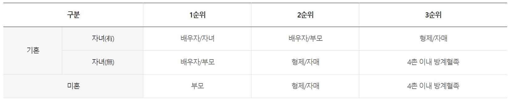 신청 2순위 이하는 동 순위 이상 자격자가 사망 시 신청가능(사망여부 확인서류 지참)