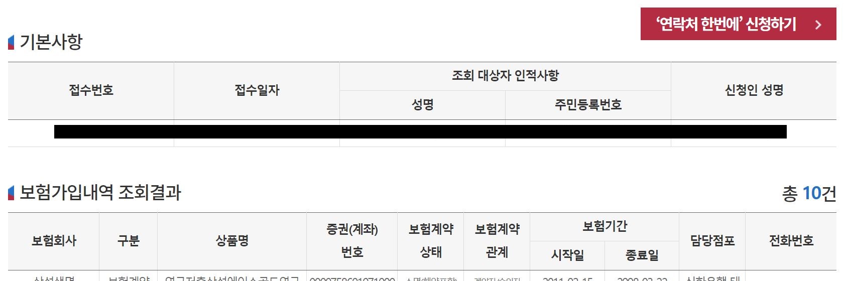 생명보험, 손해보험 조회내역은 접수일로부터 6~15일(휴일제외) 이내에 생명보험협회(생명보험), 손해보험협회(손해보험) 홈페이지에서 각각 조회하실 수 있습니다.