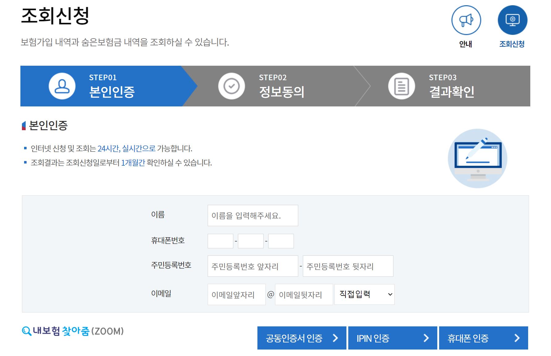 주의사항 : 금융위원회에서 알려주는 사이트 이외에는 사용하지 않습니다. 미청구보험금과 휴면보험금 환급을 유인책으로 개인정보수집을 하는 광고가 있다고 합니다.